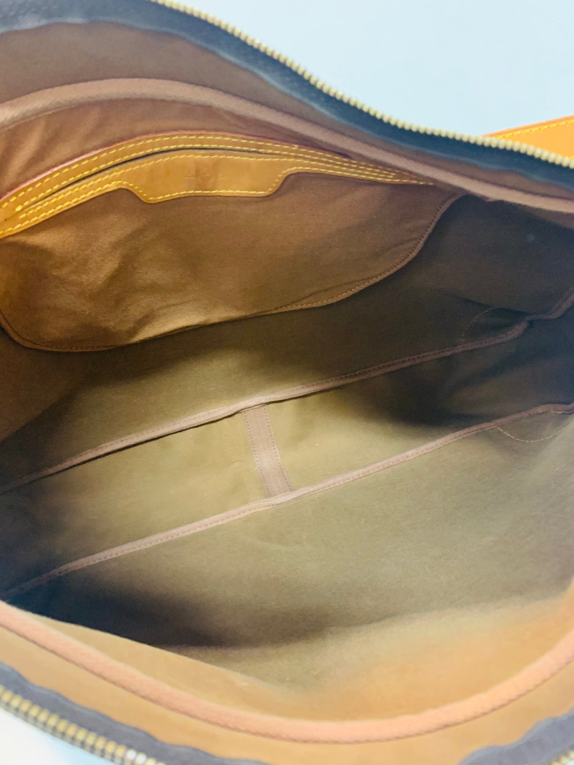 Details : This item is a great vintage and hard to find. It shows signs of wear from previous use but is still in good condition and has a lot of life left. The exterior canvas is clean and beautiful, The bottom corner edges show wear. The leather has developed a caramel patina. Interior is clean and no stains or foul smell. The goldtone hardware has surface scratches. The interior is clean and in good condition and no foul smell or unwanted smell. Please refers to the image for details.