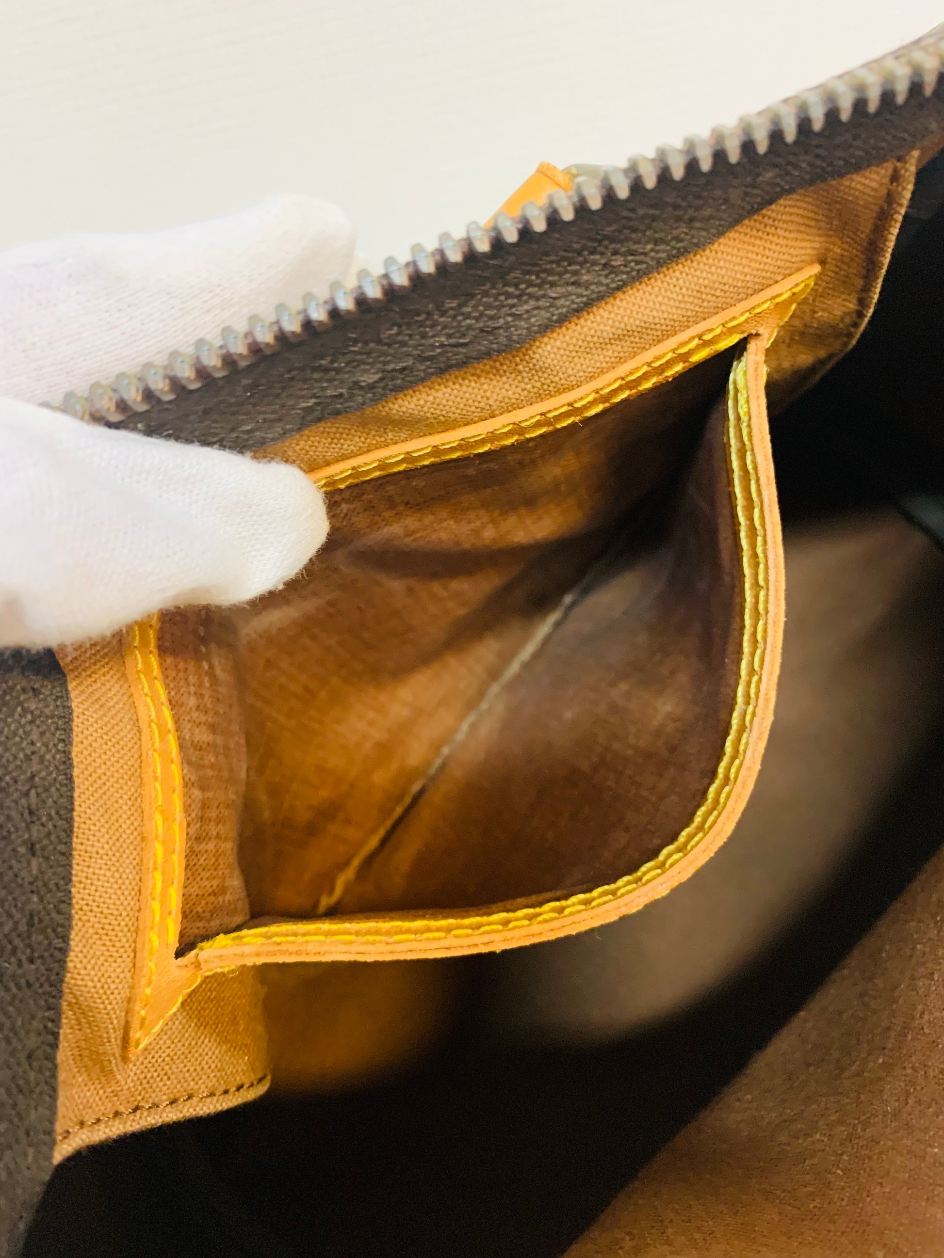 LEATHER: Shows wear from previous use.Medium honey patina.Piping are all intact and no piping exposed. Leather puller was torn.