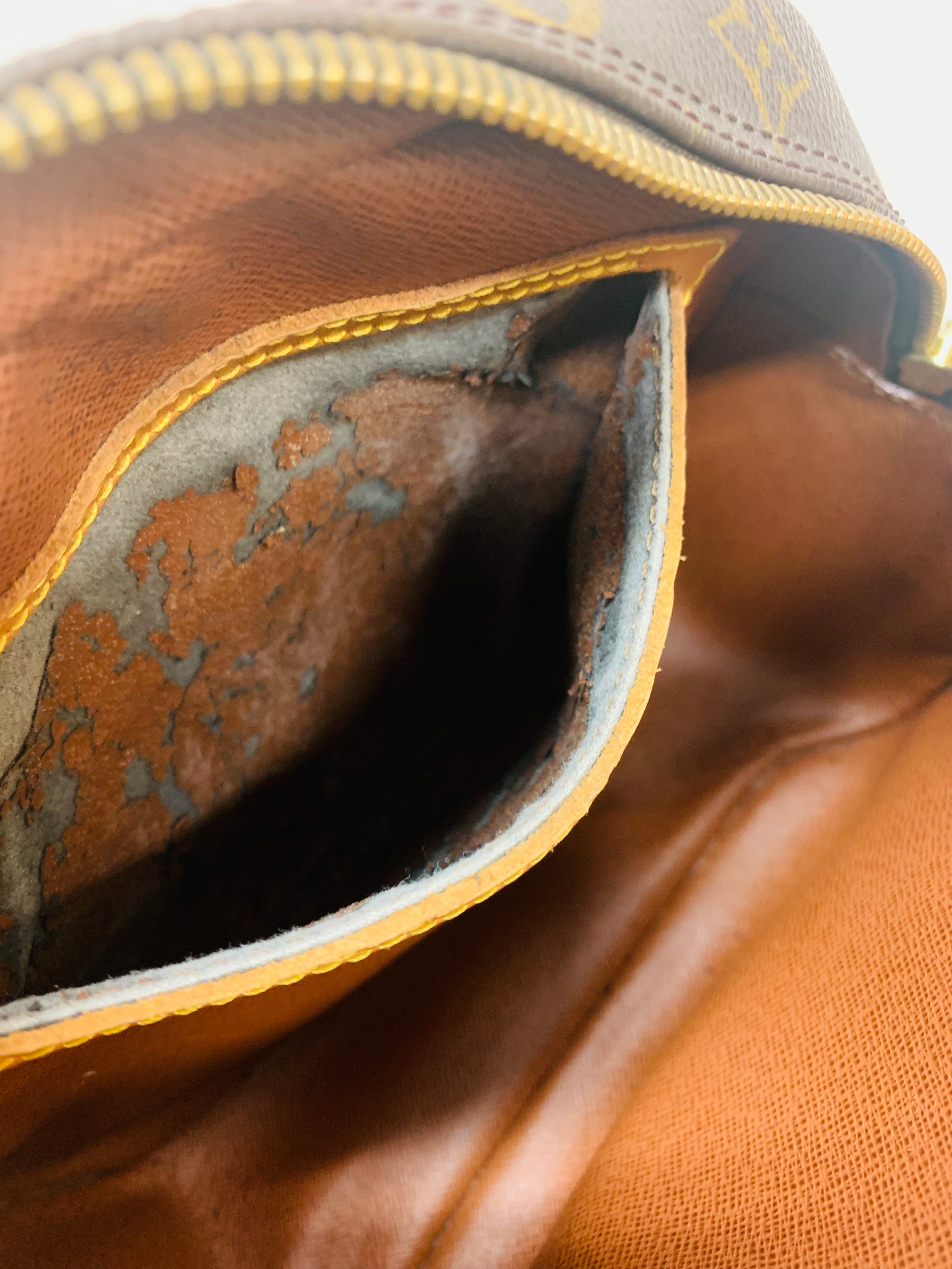 CONDITION: Very good condition,Canvas has no cracks rips or tears. Interior is clean, pockets has peeling but no stickiness. Zipper works very good.Leather is in beautiful honey patina.